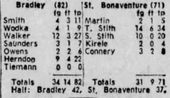 Walker scored 18 points in the first half, even though he spent seven minutes off the floor, helping Bradley to a 42–37 halftime lead. He returned twice in the second half, adding nine more points, including five during a crucial stretch when St. Bonaventure closed to within six at 69–63 with four minutes remaining.